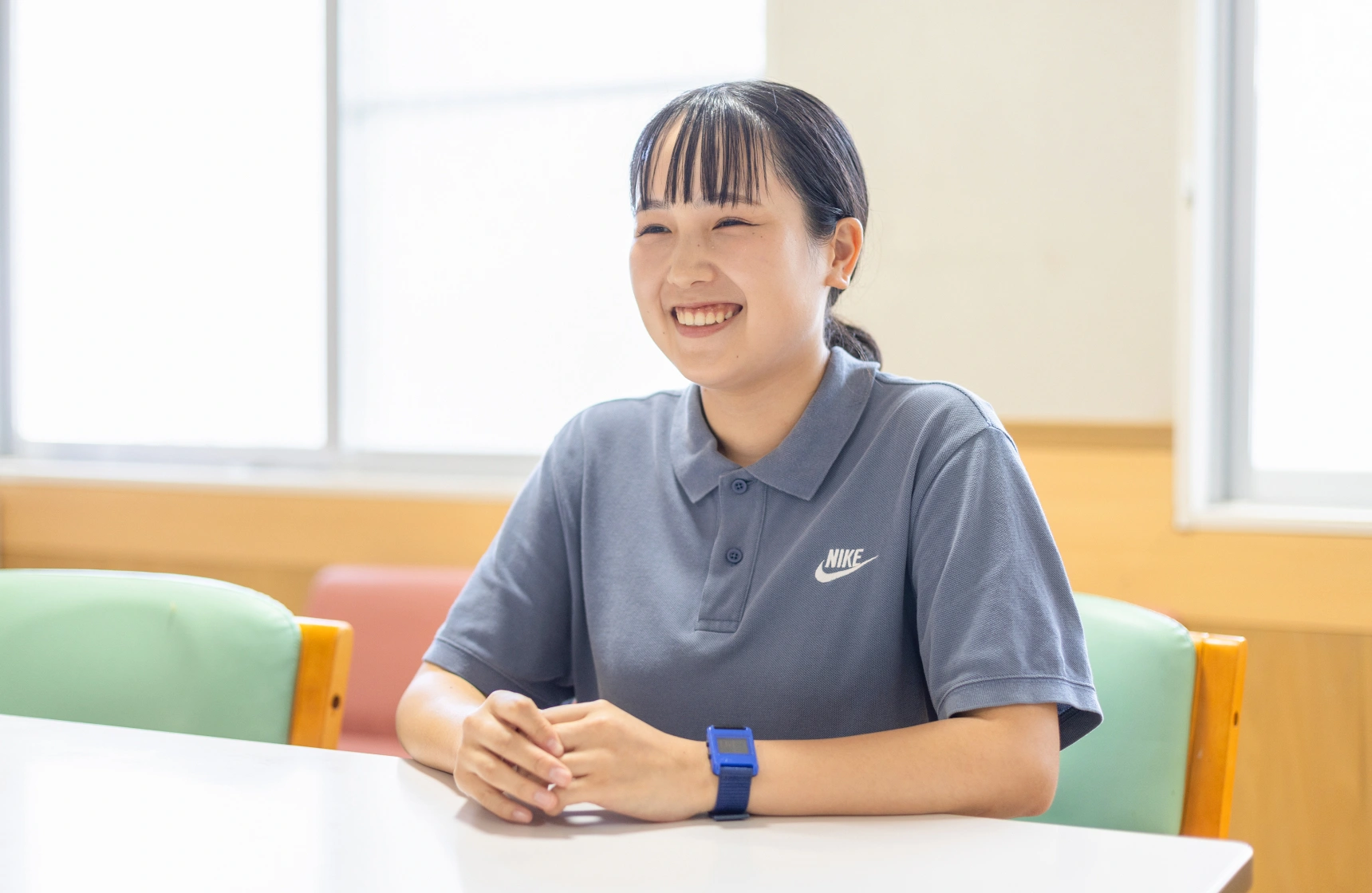 当学園を知ったのは、チューターの先生からの紹介がきっかけです。パンフレットやホームページ、求人情報から、福利厚生や給与面の充実、離職率の低さを知り、安心して長く働ける職場だと確信。さらに、施設見学で感じた明るく温かな雰囲気が決め手となり、入職を決めました。