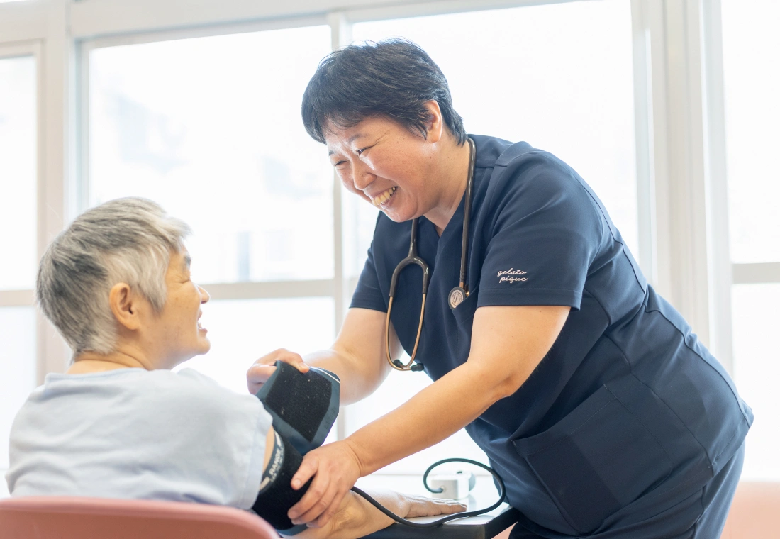 看護師は、施設を利用する方々の健康管理と医療的ケアを担当します。日々のバイタルチェックや服薬管理、医師の指示に基づく処置、体調不良時の対応、通院時の付き添いなど業務は多岐にわたります。利用者が安心して日常生活を送れるように、他職種と連携を取りながら、医療面からのサポートで暮らしを支えます。